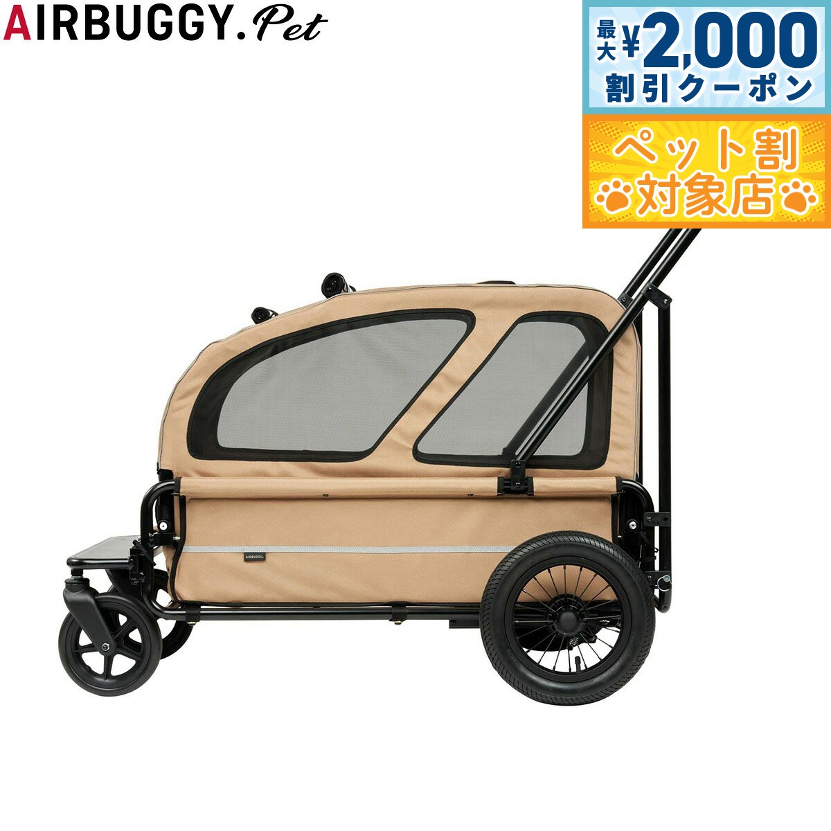 大型犬用に開発された耐荷重55kgの4輪カート。 体重の重い大型犬を乗せても、4輪の安定性と3角構造の軽快な押し心地でスムーズな走行が可能です。 愛犬が開放的に乗ることができるオープンタイプで、荷物が多い時は台車としてもご使用いただけます。 また、別売りのルーフ(別売り)を装着すれば、突然の飛び出しや移動時にも安心。 本体後部にはスロープを装備し、足腰の弱い老犬でも乗り降りがしやすいデザインになっています。 商品名エアバギー フォー ペット キャリッジ(CARRIAGE) セット(台車+ルーフ)ブランドAIRBUGGY材質アルミニウム、ポリエステル、ポリプロピレン、ポリウレタン、ゴム耐荷重55kg大きさフレーム使用時:幅70cm x 奥行き127cm x 高さ110cm、フレーム折り時:幅70cm x 奥行き107cm x 高さ45cm、キャリッジ内寸:幅44.5cm x 奥行き82cm x 高さ22cm、ルーフ内寸:幅45cm x 奥行き82.5cm x 高さ55cm生産国中国 ※こちらはキャリッジ&ルーフのセットです。 01.エアタイヤ 前輪7インチタイヤはPU素材でポリウレタン、後輪12インチには、振動の激しい路面でも衝撃吸収性を発揮するエアタイヤを装備。 エアタイヤは自転車のタイヤメーカーとして有名な『KENDA』製を採用しています。 02. ルーフ(別売り)別売りのルーフを装着すれば、愛犬の急な飛び出しを防ぐことができます。 病院などに愛犬を連れて行く際にも便利です。 03.台車としても 愛犬が開放的に乗ることができるほか、大きな買い物や重い荷物などを運ぶ際には台車としてもご利用いただけます。 04.折りたたみ 折りたたみ可能で、ちょうど車の荷台の幅に乗るサイズ。 幅もとらないので、おでかけ時に大変重宝します。 05.乗り降り 本体前後に、大きな出入口を設置。 本体の高さも低くスロープも完備しているので、足腰が弱っている老犬でも、自らコット内に入ることができます。 セット内容:リストストラップ/エアポンプ/取扱説明書本体重量総重量:15.2 kg、(ルーフなし):13 kgメーカー名株式会社GMPインターナショナルAirBuggyforDogエアバギー フォー ペット キャリッジ(CARRIAGE) セット(台車+ルーフ)大型犬用に開発された耐荷重55kgの4輪カート。 体重の重い大型犬を乗せても、4輪の安定性と3角構造の軽快な押し心地でスムーズな走行が可能です。 愛犬が開放的に乗ることができるオープンタイプで、荷物が多い時は台車としてもご使用いただけます。 また、別売りのルーフ(別売り)を装着すれば、突然の飛び出しや移動時にも安心。 本体後部にはスロープを装備し、足腰の弱い老犬でも乗り降りがしやすいデザインになっています。