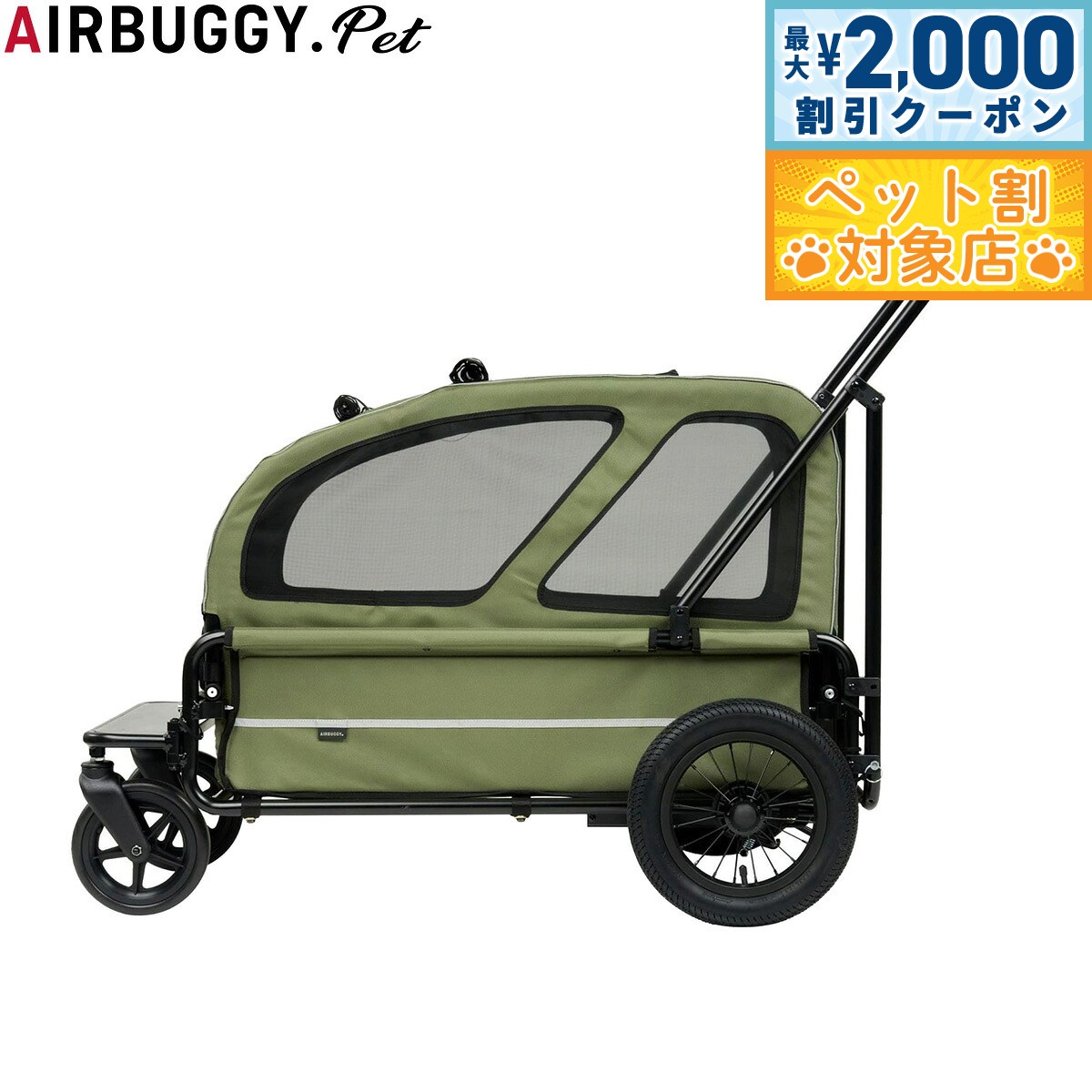 大型犬用に開発された耐荷重55kgの4輪カート。 体重の重い大型犬を乗せても、4輪の安定性と3角構造の軽快な押し心地でスムーズな走行が可能です。 愛犬が開放的に乗ることができるオープンタイプで、荷物が多い時は台車としてもご使用いただけます。 また、別売りのルーフ(別売り)を装着すれば、突然の飛び出しや移動時にも安心。 本体後部にはスロープを装備し、足腰の弱い老犬でも乗り降りがしやすいデザインになっています。 商品名エアバギー フォー ペット キャリッジ(CARRIAGE) セット(台車+ルーフ)ブランドAIR BUGGY材質フレーム:アルミニウム耐荷重55kg大きさフレーム使用時:幅70cm x 奥行き127cm x 高さ100cmフレーム折り時:幅70cm x 奥行き107cm x 高さ45cmキャリッジ内寸:幅44.5cm x 奥行き82cm x 高さ22cmルーフ内寸:幅45cm x 奥行き82.5cm x 高さ55cm地面から乗り口の高さ:20 cm生産国中国 エアタイヤ前輪7インチタイヤはPU素材でポリウレタン、後輪12インチには、振動の激しい路面でも衝撃吸収性を発揮するエアタイヤを装備。 エアタイヤは自転車のタイヤメーカーとして有名な『KENDA』製を採用しています。 台車としても愛犬が開放的に乗ることができるほか、大きな買い物や重い荷物などを運ぶ際には台車としてもご利用いただけます。 折りたたみ折りたたみ可能で、ちょうど車の荷台の幅に乗るサイズ。 幅もとらないので、おでかけ時に大変重宝します。 乗り降り本体前後に、大きな出入口を設置。 本体の高さも低くスロープも完備しているので、足腰が弱っている老犬でも、自らコット内に入ることができます。 セット用品リストストラップ/エアポンプ/取扱説明書本体重量15.2kgメーカー名株式会社GMPインターナショナルエアバギー フォー ペット キャリッジ(CARRIAGE) セット(台車+ルーフ)大型犬用に開発された耐荷重55kgの4輪カート。 体重の重い大型犬を乗せても、4輪の安定性と3角構造の軽快な押し心地でスムーズな走行が可能です。 愛犬が開放的に乗ることができるオープンタイプで、荷物が多い時は台車としてもご使用いただけます。 また、別売りのルーフ(別売り)を装着すれば、突然の飛び出しや移動時にも安心。 本体後部にはスロープを装備し、足腰の弱い老犬でも乗り降りがしやすいデザインになっています。