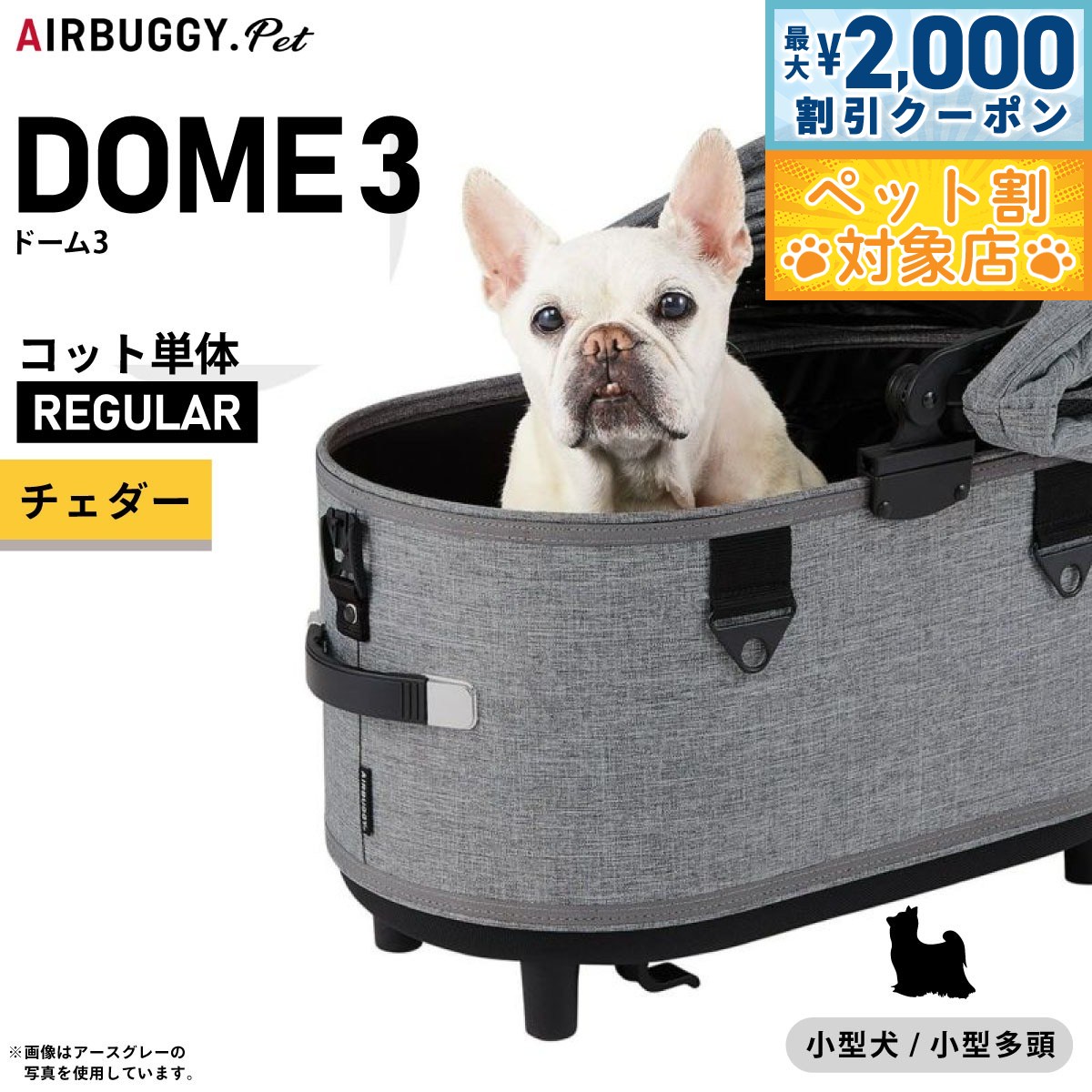 DOME3シリーズに新たにワンサイズ小さいレギュラーサイズが登場しました。 全9色のカラーバリエーションです。 使いやすい180°オープンエアールーフを採用したDOME3シリーズ。 DOME2シリーズ SMサイズと比べて天井高が6cmアップし内部空間もより広く。 体高の高い小型犬、小型多頭飼育の方におすすめです。 商品名エアバギー フォー ペット ドーム3 コット単体ブランドAIR BUGGY材質コット表地:ポリエステル100%、コット内部:底面PEボード耐荷重12kg(小型犬・小型多頭におすすめ)大きさ外 寸:H56.5cm / D58.5cm / W36.5cm、内 寸:H47.5cm / D53.5cm / W31cm生産国中国 レギュラーサイズ:トイプードル、パグ、イタリアングレーハウンドなどの小型犬・小型多頭におすすめDOME3の機能 180度開閉アコーディオンルーフ(左右どちらからでも開閉でき、好きな角度で固定できるオープンエアルーフ。 最大180度開くので、外の様子もよく見えて開放感たっぷり。 日よけとしても使えて、乗り降りもスムーズに。 )室内空間広々、15%UP(DOME2 SM 比較)DOME2と比べてコットが深くなり、ルーフの天井高も6cmアップ。 全開閉オープンエアルーフにより、居住スペースがさらに広がりました。 ワンタッチFIDLOCK (マグネット内蔵のFIDLOCK を両サイドに採用。 ルーフを近づけると、磁力でロックがかかります。 外す時は指でストラップを引っ張るだけ。 自然に外れることがないので安全性が高く、ワンアクションで開閉できる、スタイリッシュなロックです。 )キャリーハンドル(両サイドのハンドルは、伸縮式ですべりにくく、さらに持ちやすくなりました。 フレームからの着脱や、ちょっとした移動の際、重量のあるペットを乗せてもムリなく安全に持ち運びができます。 )※DOME3 COTは、従来のDOME・DOME2シリーズのフレームにも装着可能です。 本体重量4kgメーカー名株式会社GMPインターナショナルエアバギー フォー ペット ドーム3 コット単体 レギュラー チェダー DOME3シリーズに新たにワンサイズ小さいレギュラーサイズが登場しました。 全9色のカラーバリエーションです。 使いやすい180°オープンエアールーフを採用したDOME3シリーズ。 DOME2シリーズ SMサイズと比べて天井高が6cmアップし内部空間もより広く。 体高の高い小型犬、小型多頭飼育の方におすすめです。