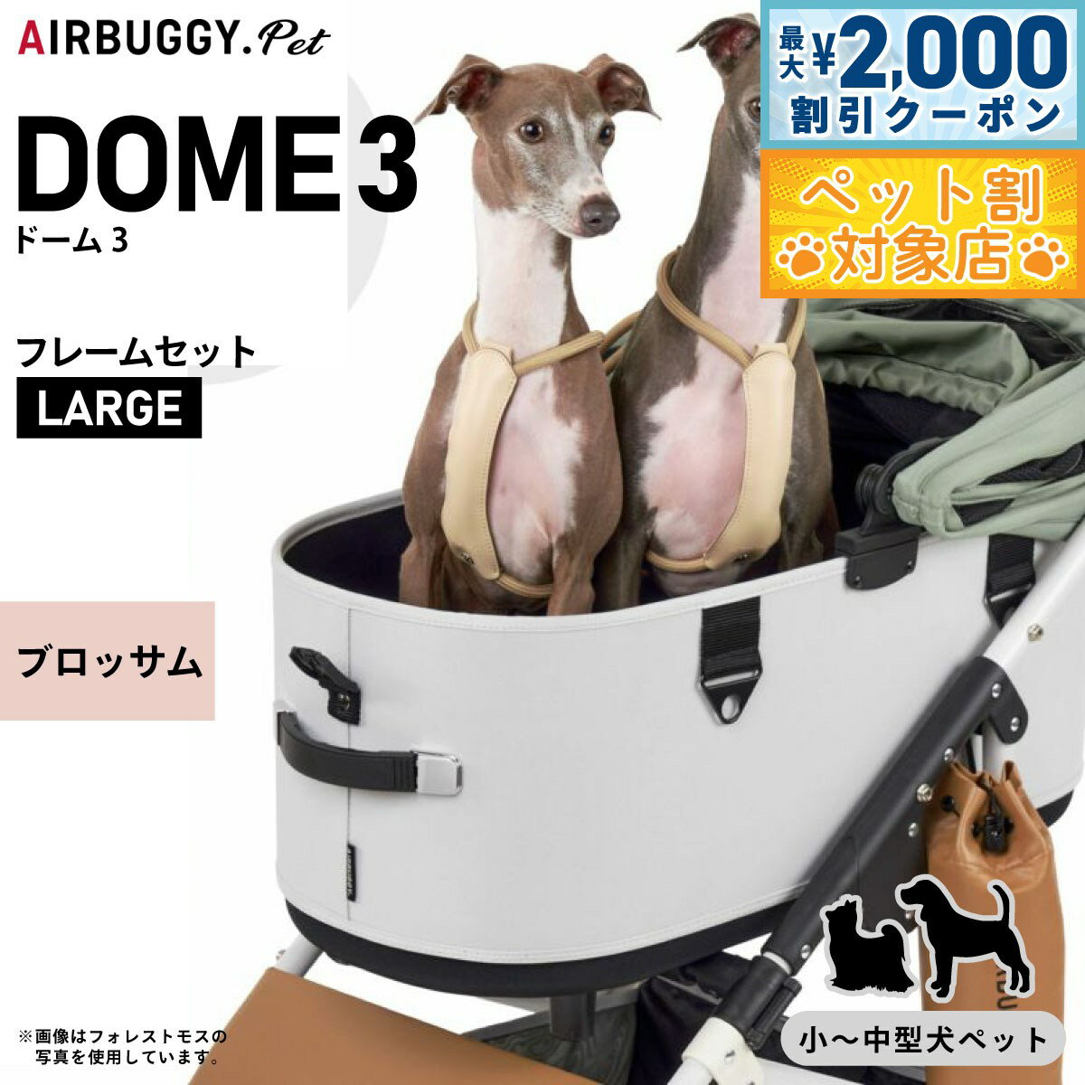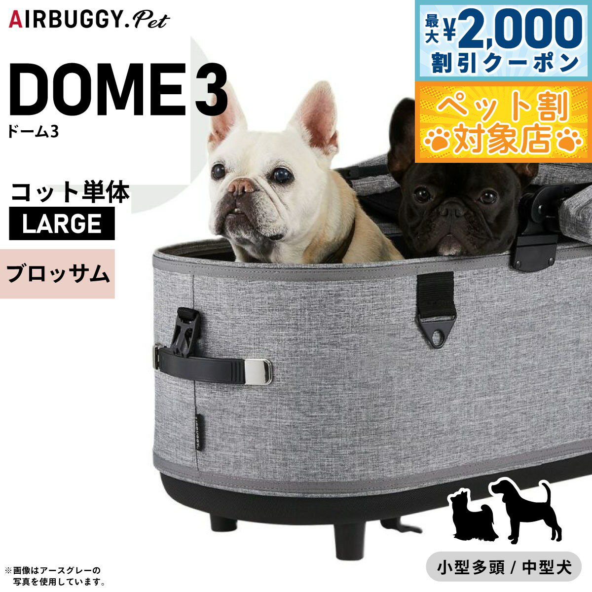 『 DOMEシリーズの最終形、ここに誕生。 』新しくなったDOME3は、室内空間が約20%アップ。 内部空間にゆとりが生まれ、多頭飼いや、より大きな犬種でも快適にお使いいただけるようになりました。 コットは180度開くオープンエアルーフを採用。 左右どちらからでもワンタッチで開閉できます。 持ち運びは、両手のハンドルで安全に。 エアバギーならではの快適な走り心地はそのままに、出入りしやすく、よりスマートに生まれ変わりました。 商品名エアバギー フォー ペット ドーム3 コット単体ブランドAIR BUGGY材質コット表地:ポリエステル100%、コット内部:底面PEボード耐荷重20kg(小型多頭・中型犬・体高の高い犬種におすすめ)大きさ外 寸:H58.5cm / D72cm / W37cm、内 寸:H52cm / D66cm / W32cm生産国中国 ラージサイズ:小型多頭、柴犬・ビーグルなどの中型犬、アメリカンコッカーなど体高の高い犬種におすすめDOME3の機能 180度開閉アコーディオンルーフ(左右どちらからでも開閉でき、好きな角度で固定できるオープンエアルーフ。 最大180度開くので、外の様子もよく見えて開放感たっぷり。 日よけとしても使えて、乗り降りもスムーズに。 )室内空間広々、20%UP(DOME2 M 比較)DOME2と比べてコットが深くなり、ルーフの天井高も9cmアップ。 全開閉オープンエアルーフにより、居住スペースがさらに広がりました。 ワンタッチFIDLOCK (マグネット内蔵のFIDLOCK を両サイドに採用。 ルーフを近づけると、磁力でロックがかかります。 外す時は指でストラップを引っ張るだけ。 自然に外れることがないので安全性が高く、ワンアクションで開閉できる、スタイリッシュなロックです。 )キャリーハンドル(両サイドのハンドルは、伸縮式ですべりにくく、さらに持ちやすくなりました。 フレームからの着脱や、ちょっとした移動の際、重量のあるペットを乗せてもムリなく安全に持ち運びができます。 )※DOME3 COTは、従来のDOME・DOME2シリーズのフレームにも装着可能です。 本体重量4.1kgメーカー名株式会社GMPインターナショナルエアバギー フォー ペット ドーム3 コット単体 ラージ ブロッサム 『 DOMEシリーズの最終形、ここに誕生。 』新しくなったDOME3は、室内空間が約20%アップ。 内部空間にゆとりが生まれ、多頭飼いや、より大きな犬種でも快適にお使いいただけるようになりました。 コットは180度開くオープンエアルーフを採用。 左右どちらからでもワンタッチで開閉できます。 持ち運びは、両手のハンドルで安全に。 エアバギーならではの快適な走り心地はそのままに、出入りしやすく、よりスマートに生まれ変わりました。