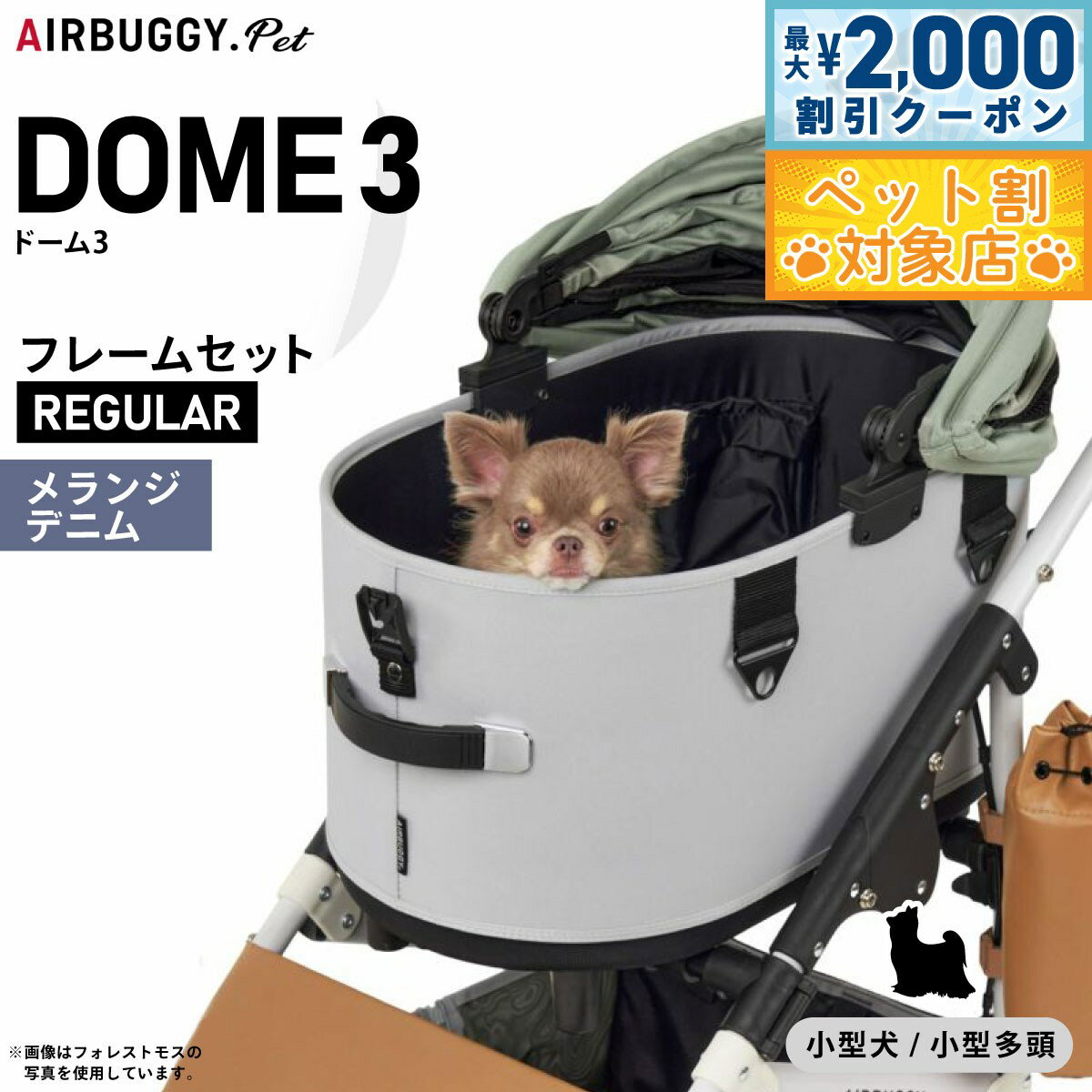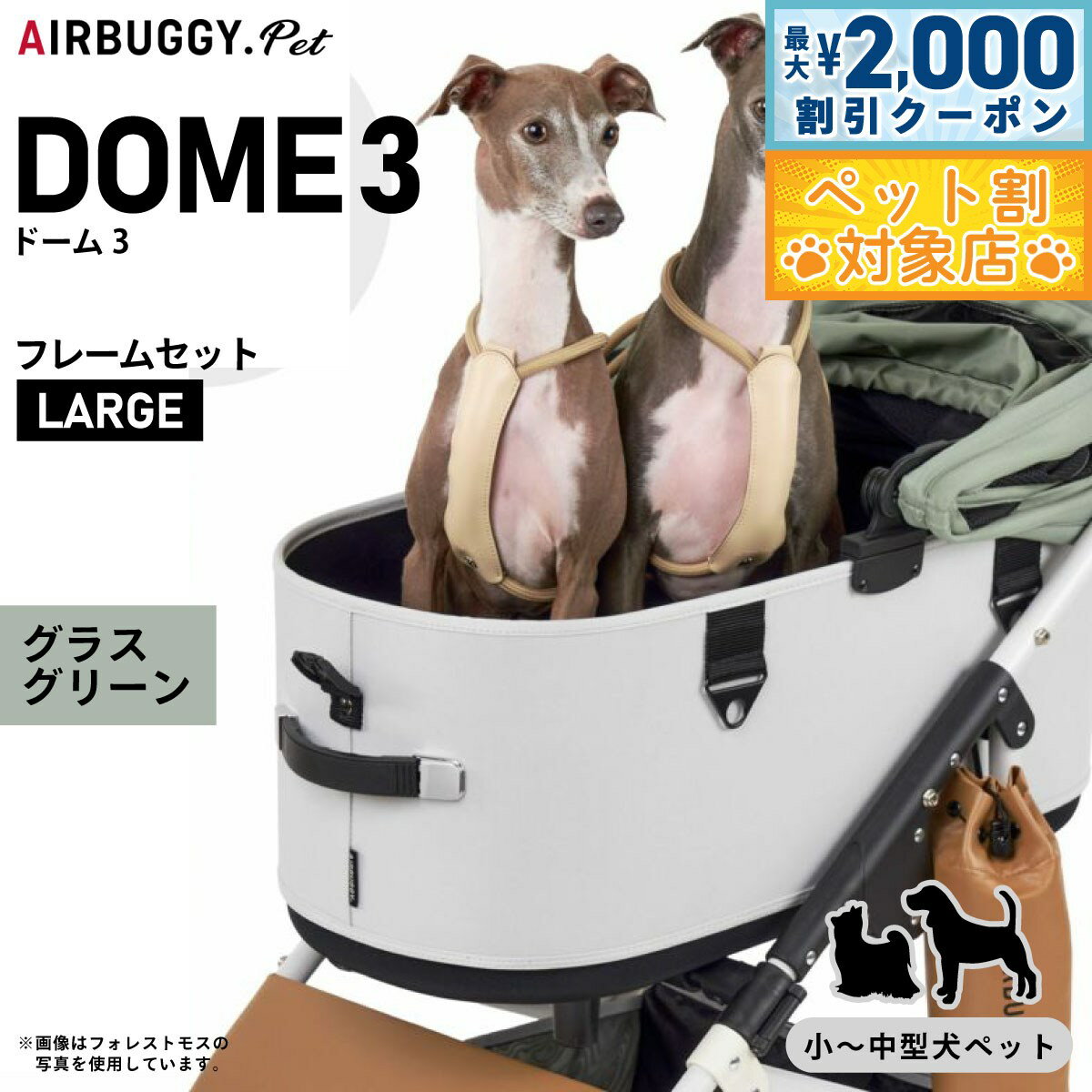 『 DOMEシリーズの最終形、ここに誕生。 』新しくなったDOME3は、室内空間が約20%アップ。 内部空間にゆとりが生まれ、多頭飼いや、より大きな犬種でも快適にお使いいただけるようになりました。 コットは180度開くオープンエアルーフを採用。 左右どちらからでもワンタッチで開閉できます。 持ち運びは、両手のハンドルで安全に。 エアバギーならではの快適な走り心地はそのままに、出入りしやすく、よりスマートに生まれ変わりました。 商品名エアバギー フォー ペット ドーム3 セットブランドAIR BUGGY材質フレーム:アルミニウム・樹脂、コット表地:ポリエステル100%、コット内部:底面PEボード耐荷重20kg(小型多頭・中型犬・体高の高い犬種におすすめ)大きさフレーム(使用時:H105cm / D96cm / W53.5cm、折畳時:H82cm / D30cm / W53.5cm)、コット単体(外 寸:H58.5cm / D72cm / W37cm、内 寸:H52cm / D66cm / W32cm)生産国中国 ラージサイズ:小型多頭、柴犬・ビーグルなどの中型犬、アメリカンコッカーなど体高の高い犬種におすすめ。 標準装備:コット取り付けアダプター、バスケット(17L)、マルチホルダー×2個、リストストラップ、エアポンプ、飛び出し防止用リード(コット内に装備)×2個、取扱説明書DOME3の機能 180度開閉アコーディオンルーフ(左右どちらからでも開閉でき、好きな角度で固定できるオープンエアルーフ。 最大180度開くので、外の様子もよく見えて開放感たっぷり。 日よけとしても使えて、乗り降りもスムーズに。 )ワンタッチFIDLOCK (マグネット内蔵のFIDLOCK を両サイドに採用。 ルーフを近づけると、磁力でロックがかかります。 外す時は指でストラップを引っ張るだけ。 自然に外れることがないので安全性が高く、ワンアクションで開閉できる、スタイリッシュなロックです。 )キャリーハンドル(両サイドのハンドルは、伸縮式ですべりにくく、さらに持ちやすくなりました。 フレームからの着脱や、ちょっとした移動の際、重量のあるペットを乗せてもムリなく安全に持ち運びができます。 )らくらくワンタッチ装着(レバーを引くだけのワンアクションで、フレームから簡単に取り外しが可能。 お部屋でも、クルマでも、どこでもストレスなく持ち運びできます。 )折りたたみ可能(フレームは、ハンドルの左右のレバーを握って降ろせばかんたんに折りたたみ可能。 厚さ30cmになるので、クルマでも玄関でも場所をとりません。 )便利なマルチホルダー(フレームの両サイドには小物や500mlのペットボトルが入るマルチホルダーを装備。 保冷・保温機能付きなので、暑い季節も快適にお散歩できます。 )本体下部に17Lの大容量バスケットを搭載。 両サイドのジッパーで開閉でき、荷物の出し入れもスムーズです。 急な買い物など、荷物が増えても安心です。 (耐荷重5kg)コット:4.1kg、フレーム+コット取り付けアダプター:8kg、フレーム+コット取り付けアダプター+コット:12.1kgメーカー名株式会社GMPインターナショナルエアバギー フォー ペット ドーム3 セット 『 DOMEシリーズの最終形、ここに誕生。 』新しくなったDOME3は、室内空間が約20%アップ。 内部空間にゆとりが生まれ、多頭飼いや、より大きな犬種でも快適にお使いいただけるようになりました。 コットは180度開くオープンエアルーフを採用。 左右どちらからでもワンタッチで開閉できます。 持ち運びは、両手のハンドルで安全に。 エアバギーならではの快適な走り心地はそのままに、出入りしやすく、よりスマートに生まれ変わりました。