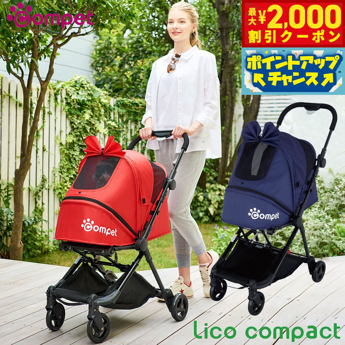 手提げでラクラク持ち運びができる、収納にも便利な超コンパクトモデルのペットカートが登場!たたんだ状態で、持ち運びがしやすいグリップを搭載。 超コンパクト設計なので、自動車に載せる時や、玄関に置く時も収納場所に困りません。 ※本製品には専用リードが2本付属します。 商品名コムペット ペットカート リコ コンパクトブランドCOMPET耐荷重耐荷重:12kg(2匹まで、ペット専用)、荷物カゴ耐荷重:2.5kg大きさ使用時:W481×D820×H1030mm、折畳時:W481×D353×H480mm、キャリー内寸(幌を除く):W280×D600×H150mm(先端部H180mm) 【圧倒的にコンパクト】車体を折りたたむと、体積比80%減の超コンパクト設計!自動車に載せる時も、玄関に置く時も収納場所に困りません。 【通気性】幌の前後についた開閉式のメッシュ窓で通気性を確保。 夏もキャリー内を蒸らさずに乗せることができます。 【シングルタイヤ】前後輪シングルタイヤで、押す時に足がタイヤにぶつかりにくく快適です。 【軽量&持ち運び用グリップでラクラク】重量は軽量6.1kg。 更に「持ち運び用グリップ」で畳んだ車体を手に提げて持てるので、ラクラク運ぶことができます。 ※本製品には専用リードが2本付属します。 本体重量6.1kg色展開ネイビー、レッドメーカー名コンビ株式会社コムペット ペットカート リコ コンパクト車体を折りたたむと、体積比80%減の超コンパクト設計!自動車に載せる時も、玄関に置く時も収納場所に困りません。 幌の前後についた開閉式のメッシュ窓で通気性を確保。 夏もキャリー内を蒸らさずに乗せることができます。 前後輪シングルタイヤで、押す時に足がタイヤにぶつかりにくく快適です。 重量は軽量6.1kg。 更に「持ち運び用グリップ」で畳んだ車体を手に提げて持てるので、ラクラク運ぶことができます。 手提げでラクラク持ち運びができる、収納にも便利な超コンパクトモデルのペットカートが登場!たたんだ状態で、持ち運びがしやすいグリップを搭載。 超コンパクト設計なので、自動車に載せる時や、玄関に置く時も収納場所に困りません。 ※本製品には専用リードが2本付属します。