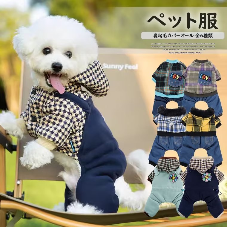 裏地はモコモコで保温性バツグン!選べる6種類 犬 冬服 アウター デニム風 カバーオール ズボン付き ロンパース つなぎ フード付き デニムカバーオール 抜け毛防止 ドッグウェア 暖かい 温かい チェック柄 切替 2,400 ~