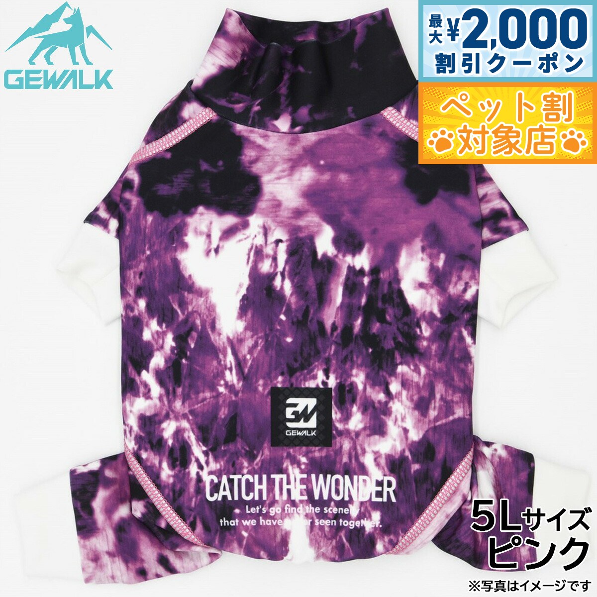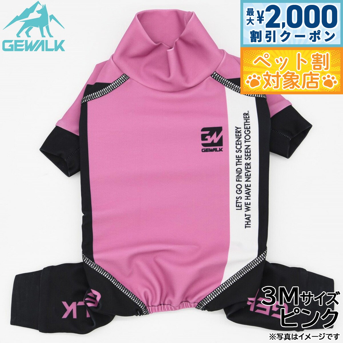高機能オールシーズンモデルのロンパース商品名ジウォーク GEWALK トリコロール カラー プリント プロテクト ストレッチ ロンパースブランドGEWALK材質ポリエステル78%、ポリウレタン22%生産国ベトナム 夏は涼しく、冬はあったかい高機能オールシーズンモデルです。 ウェア全体に撥水加工が施されており、水や泥などの汚れから愛犬をプロテクト!「4WAYスーパーストレッチ+フラットシーマ縫製」を採用し、縫い目が平でゴロつかない着心地と抜群のフィット感により動きやすさを実現しました。 最高クラスの紫外線遮蔽率であるUPF50+を実現し、夕暮れ時でもしっかり視認できるストレッチマルチリフレクターにより安全性も追求!雨の日や雪中でのお散歩はもちろん、海や川、山やドッグランなど様々なアウトドアシーンで大活躍のアクティブロンパースです。 【中型】適応サイズ:3L、背丈:43cm、胸囲:58〜62cm、首回り:33〜37cm【使用上のご注意】・火気に近づけたり、高温になる場所に保管しないで下さい。 ・洗濯機・乾燥機は避け、必ず手洗い・自然乾燥をして下さい。 ・洗剤を使用して洗う際には中性洗剤を使用し、漂白剤の使用は避けて下さい。 ・色落ち色うつりする恐れがありますので他の物と一緒に洗わず、必ず単品洗いをして下さい。 ・長時間水に浸けておくと色が落ちる恐れがあります。 タンブラー乾燥は縮む恐れがありますのでお避け下さい。 ・プリント・マーク部分のもみ洗いとアイロンはお避け下さい。 ・使用頻度により破損や、装飾品が取れる場合があります。 ・破損個所が見られた際には、誤飲の原因にもなりますので、すぐに使用を中止して下さい。 ・万一飲み込んだ場合にはすぐに取り出し、獣医師にご相談下さい。 メーカー名株式会社ハヤブサジウォーク GEWALK トリコロール カラー プリント プロテクト ストレッチ ロンパース高機能オールシーズンモデルのロンパース 【最大2000円OFFクーポン!&店内ポイント最大60倍!スーパーSALE!】ジウォーク GEWALK トリコロール カラー プリント プロテクト ストレッチ ロンパース 3L ピンク 犬服 ドッグウェア ペットウェア 6,050 ~
