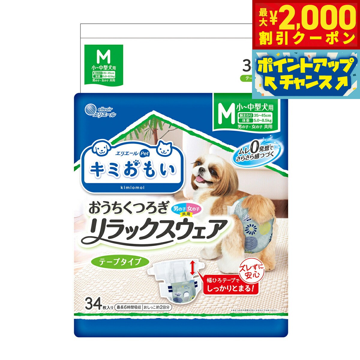 Mサイズ。 小型〜中型犬用。 男の子・女の子共用。 ズレずに安心。 幅広テープでしっかりとまる!面が広いから、圧力分散で締めつけない。 締め付けないのにフィットします。 スピード吸収体&全面通気性シートでムレにくい。 ムレ0発想でさらさら感が続き、お肌にやさしい。 男の子も女の子も安心のフロントポケット構造。 お洋服とのあわせ方でも楽しめる北欧風デザイン。 商品名エリエール キミおもい リラックスウェアブランドエリエール材質表面材:ポリオレフィン系不織布、吸水材:綿状パルプ・高分子吸水材・ポリオレフィン系不織布、止着剤:ポリオレフィン、防水材:ポリオレフィン系フィルム、伸縮剤:ポリウレタン、結合材:スチレン系合成樹脂 等生産国中国 ムレ0発想でさらさら感続く!お肌にやさしいスピード吸収体。 全面通気性シート。 ※おむつの中の湿度が0%になるわけではありません。 幅ひろテープでズレずに安心!締め付けずにふんわりフィット。 ウエスト部のテープの幅が広く、面でフィットして力が分散。 【男の子も女の子も!共用タイプ】●洋服との合わせ方も楽しめる北欧風デザイン:男女共用。 おむつっぽくない。 お洋服と合わせても◎●男の子も女の子も安心!フロントポケット構造:男の子の性器もしっかりおさまる。 お腹まわりからのモレをブロック。 適応胴周りサイズ:35〜45cm適応体重:5.0〜8.5kg代表的な犬種(成犬時):シーズー、ミニチュア・ダックスフンド、豆柴、パグ、フォックス・テリアなど ※目安です。 愛犬の成長度合い、体型によりサイズが異なる場合がございます。 対象ペット:犬メーカー名大王製紙 株式会社エリエール キミおもい リラックスウェアMサイズ。 小型〜中型犬用。 男の子・女の子共用。 ズレずに安心。 幅広テープでしっかりとまる!面が広いから、圧力分散で締めつけない。 締め付けないのにフィットします。 スピード吸収体&全面通気性シートでムレにくい。 ムレ0発想でさらさら感が続き、お肌にやさしい。 男の子も女の子も安心のフロントポケット構造。 お洋服とのあわせ方でも楽しめる北欧風デザイン。
