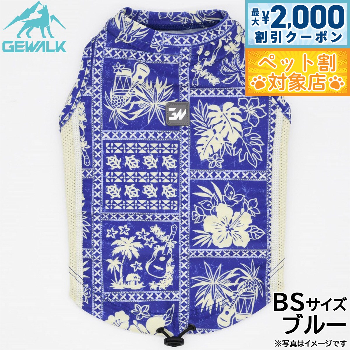 暑さや紫外線から愛犬を守ります!商品名ジウォーク GEWALK ハワイアン パッチワーク プリント アクティブ サンシェード タンクトップブランドGEWALK材質ポリエステル87%、ポリウレタン13%、別布:ポリエステル100%生産国ベトナム リサイクルファブリックを使用したサステナブルコンセプトのウェア。 暑さや紫外線から愛犬を守るサンシェードタンクトップ!最高クラスの紫外線遮蔽率であるUPF50+を実現し暑さや紫外線から愛犬を守ります!速乾性に優れ、お水を吹きかけると気化熱により涼しく快適に。 また、「4WAYスーパーストレッチ+フラットシーマ縫製」を採用し、縫い目が平らでゴロつかない着心地と抜群のフィット感により動きやすさを実現しました。 UVカット、遮熱効果が高く、お散歩やドッグランにおすすめで、動きやすいサンシェードタンクトップです。 適応サイズ:L、背丈:35cm、胴回り:47〜54cm、首回り:30〜35cm【使用上のご注意】・火気に近づけたり、高温になる場所に保管しないで下さい。 ・洗濯機・乾燥機は避け、必ず手洗い・自然乾燥をして下さい。 ・洗剤を使用して洗う際には中性洗剤を使用し、漂白剤の使用は避けて下さい。 ・色落ち色うつりする恐れがありますので他の物と一緒に洗わず、必ず単品洗いをして下さい。 ・長時間水に浸けておくと色が落ちる恐れがあります。 タンブラー乾燥は縮む恐れがありますのでお避け下さい。 ・プリント・マーク部分のもみ洗いとアイロンはお避け下さい。 ・使用頻度により破損や、装飾品が取れる場合があります。 ・破損個所が見られた際には、誤飲の原因にもなりますので、すぐに使用を中止して下さい。 ・万一飲み込んだ場合にはすぐに取り出し、獣医師にご相談下さい。 メーカー名株式会社ハヤブサジウォーク GEWALK ハワイアン パッチワーク プリント アクティブ サンシェード タンクトップ暑さや紫外線から愛犬を守ります! 【最大2000円OFFクーポン!&店内ポイント最大60倍!本日限定!】ジウォーク GEWALK ハワイアン パッチワーク プリント アクティブ サンシェード タンクトップ L ブルー 犬服 ドッグウェア ペットウェア 3,300 ~
