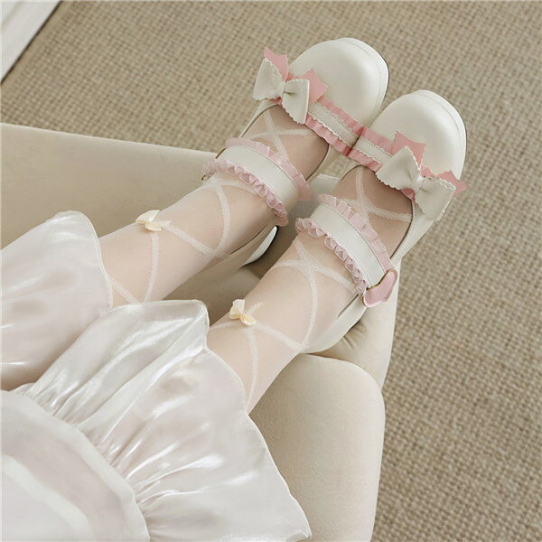 おすすめポイントPoint 1: 【レースアップ×フリルで王道かわいい!】編み上げデザインと履き口のフリルが絶妙にマッチ!お人形さんのようなガーリーな足元を演出し、縦のラインで脚をすっきり見せる視覚効果もバッチリです。 Point 2: 【サイドの立体リボンで360度完璧シルエット】大きな立体リボンが存在感抜群!正面だけでなく横から見ても愛らしさが際立ち、どこから写真を撮っても映える「主役級」のデザインです。 Point 3: 【足元に品を添えるパール風ビジュー】履き口にあしらわれたパール風のデザインが、まるでアクセサリーのような華やかさをプラス。 上品なアクセントになり、高見え効果も期待できます。 Point 4: 【5.5cmの太ヒールで安定感&スタイルアップ】接地面の広い太ヒールは安定感抜群。 5.5cmの程よい高さで、自然に盛りつつも歩きやすいのが魅力です。 長時間歩くテーマパークや、ライブイベント参戦にも最適です。 Point 5: 【選べる3カラー展開!】清楚な「ホワイト」、クールで小悪魔な「ブラック」、甘い雰囲気の「ピンク」。 推しのカラーや、その日のコーデのテイストに合わせて選べる万能なカラーバリエーションです。 素材:表面材質:合成皮革インナー裏地:合成皮革底面材質:ゴム底カラー:ピンク/ホワイト/ブラックセット内容:一足のみサイズ:34(内寸22cm) 35(内寸22.5cm) 36(内寸23cm) 37(内寸23.5cm) 38(内寸24cm) 39(内寸24.5cm)平置き採寸となりますので、多少の誤差についてはご容赦下さい。