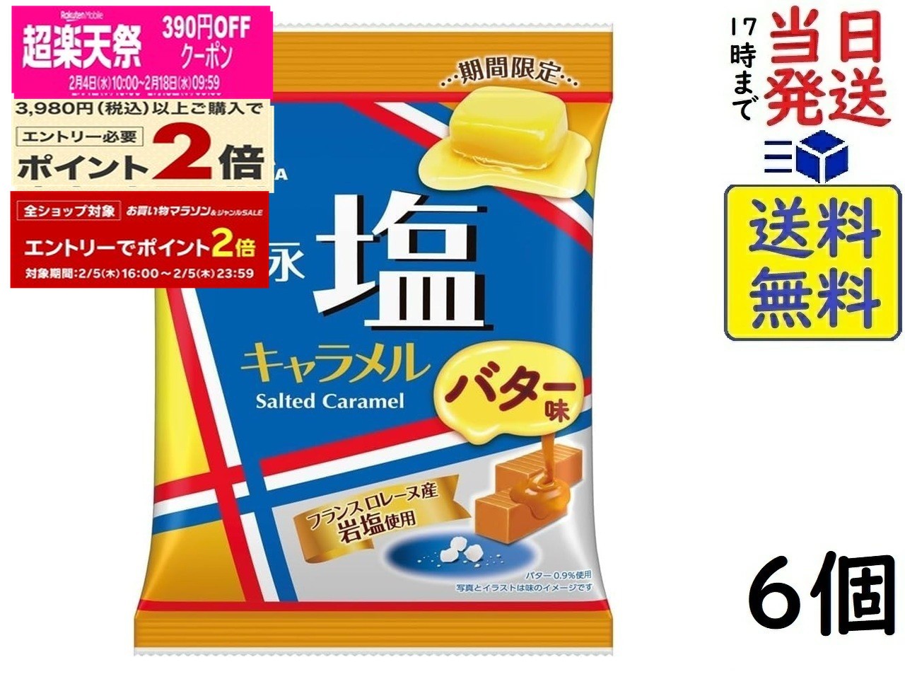 森永製菓 塩キャラメル バター味 69g×6個賞味期限2026/09 【送料無料】【当日発送】【ポスト投函】 塩キャラメル バター味 69g家事や仕事の疲れを感じた時、濃厚な味わいの中に、アクセントとなるフランスロレーヌ産岩塩味とバターのコク深い味わいがココロとコバラを満たし、気分を癒してくれるキャラメルです。原材料: 水あめ(国内製造)、調製練乳(生乳、砂糖、ナチュラルチーズ、クリーム、脱脂粉乳、植物油脂、乳糖)、砂糖、植物油脂、ナチュラルチーズ、脱脂粉乳、還元水あめ、小麦たんぱく加水分解物、バター、食塩、モルトエキス、デキストリン/ソルビトール、硫酸マグネシウム、香料、乳化剤(大豆由来)、炭酸カルシウムこの商品はポスト投函商品です。日時指定頂いても対応できませんのでご了承ください。(複数個の場合は宅急便になる場合がございます。)JAN: 4902888273186 2 森永製菓 塩キャラメル バター味 69g×6個賞味期限2026/09 1,280 ~