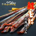 鮭とばは北海道、東北地方の冬の風物詩で鮭を半身にし 細かく帯状にし天日で干したものを指します。 脂乗りのよい秋鮭を使うことでマイルドな塩加減が出ます。 当商品は道東沖合で獲れた新鮮な鮭を加工しています。 スルメのような食べ物のため歯の弱い方は細かく切って お召し上がりください。 <br> 北海仕込み鮭とば 250g 鮭(北海道産)、ソルビット、食塩、トレハロース、調味料(アミノ酸等) 鮭 製造より30日 直射日光、高温多湿を避け28℃以下で保存してください |
