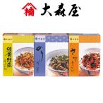 ふりかけ・お茶漬けを詰め合わせたバラエティギフトです。 ■商品名:大森屋お茶漬・ふりかけ詰合せ ■商品:緑黄野菜ふりかけ(7袋入)・さけふりかけ(7袋入)・のり茶漬(5袋入)各1 ■加工地:日本 小麦・卵・乳・エビ ■箱:約30×13×5.5cm(化粧箱) ※内容・パッケージ・原産地・加工地等が変更になる場合がございます。
