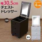 人気 おしゃれ チェストドレッサーです 天板を開けると鏡が付いていて、収納も出来ます 引出し3杯付きです コスメや小物を収納するのに便利です 1段目、2段目の引き出しの奥には背の高いものも収納できるよう深型の収納スペースになっています(深さ約28cm) キャスター付なので移動も楽です 材質はプリント紙化粧繊維板です 木材を繊維状に粉砕し、接着剤で加熱圧縮した板(繊維板)に、木目等を印刷した紙を貼って仕上げた板です 貼り合わせ箇所に捲れがありますので、ご了承下さい(不良交換対象外です) ダークブラウン、ホワイト 幅305×奥行415(取っ手含む)×高さ505mm ミラーサイズ:横200×縦295mm 本体重量:14.1kg(梱包重量:15.3kg) 組立式(約50分/プラスドライバーをご用意下さい)1個口 プリント紙化粧繊維板 ミラー キャスター4個(うち2個ストッパー付き) ※沖縄県への発送は出来ません。