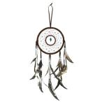 悪夢は網目に引っかかったまま夜明けと共に消え去り、良い夢だけが網目から羽を伝わって降りてきて眠っている人のもとに入るいう魔除けのお守り、ドリームキャッチャーです。 ブルーのビーズがアクセントになっています |