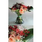 バラをメインに組んだアレンジを、専用のガラス瓶にいれてお届けいたします。 花の丈は約25cm程度なので、そのままテーブルにおいて飾るのにちょうど良いサイズです。 花瓶がなくてもそのまま飾れて、便利なアレンジセットです。 名刺サイズのメッセージカードをお付けすることができます。 ご希望の方は、下記のコメント欄にメッセージをご記入ください。 [お届け日をご指定する場合] 3営業日前までにご注文ください。 また、物日に合わせてのお届けの場合は、7営業日前までにご注文ください。 ■内容 バラ単価¥100〜¥300バラ以外の花材専用花瓶 |