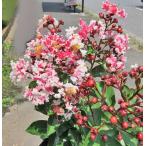 矮性サルスベリ(夏祭り・ペパーミントレース)6号 鉢底から高さ約70cm。 ・ミソハギ科サルスベリ属の落葉低木。 ・学名: Lagerstroemia indica L ・中国原産。 花期7〜9月。 ・『ペパーミントレース』夏祭りは、花の一つ一つが紅に白覆輪で、花穂全体が泡立つようなレース模様になっています。 サルスベリのなかでは唯一、花色が2色組み合わさった品種です。 ・最終樹高:2m前後の中低木なので、お庭が狭いという方や、ベランダで鉢植えで育てたいという方にオススメです。 ・小花の集合した花房は長く持ちます。 小花が次から次に咲き続けるので、全体で見ると百日も咲いているように見えます。 「百日紅」さるすべりは難読漢字の一つですが、樹がある程度大きくなると、幹がつるつるしてくるため「猿滑り」という訓が当てられています。 ・植え付けは日当たりの良い場所に、堆肥・腐葉土などを入れて植えます。 樹勢は強健で、元来暖地性の樹ですが、北海道南部まで、露地での植栽が見られます。 ・植付け適期は。 桜の咲く頃と、落葉後ですが、本品はポット苗木なので、いつでも植えられます。 ・施肥は9月頃、油粕と粒状化成肥料を等量混ぜたものをやります。