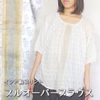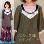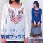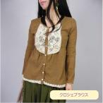 クレープブラウス 袖先・ボトム・胸元に白クロシェットがあり、とってもキュート♪<br / ワイドで短めの袖がボヘミアンテイスト 重ね着も楽しめます。 モデル身長150cmサイズM |
