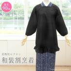 ※こちらの商品は1点までメール便配送が可能です。 他商品との同梱・2点以上は通常配送料のみの発送となります。 着物用エプロン和装割烹着 とってもシンプル&スタンダードデザインの着物用割烹着です。 汚れの目立ちにくい黒色で普段使いから法事・喪服などに合わせてご使用でき、大切なお着物を汚れから守ります。 袖は着物用にふっくらした作りで、たもとがゆったり入り、袖が垂れ下がらない7分丈になっております。 帯や体型にあわせて調節できるよう、後の首元・腰部分の2箇所に結び紐がついております。 右手側にサイドポケット1つ。 動きに無理のない立体裁断で着心地抜群です。 身丈90cm裄丈:60cm前後 幅:約50cm〜紐結びで調節可能 身長160cmのスタッフ着用例…膝上10cm程度の座った際にも上半身から膝上をカバー。 中国製 ポリエステル70%綿30% ※生地素材の特質上『糸フシの凹凸』『スジ状の節』等がある場合がございます。 予めご了承ください。