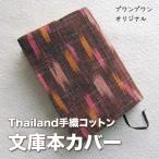 タイチェンマイの木綿織物工房の手織綿地でブックカバーを作りました。 和風なカラーは草木染めで所々に線柄の絣も和風です。 内側にインドの木版で花柄をワンポイントでプリントしました。 青少年活動支援NPOと共同商品シリーズです。 裏地は日本製の麻を使っています。 しおりはスエード風テープです。 -素材表地綿100%裏地:麻100% -サイズ16cm×30cm(広げたとき)本の厚みにより左の端の折り巾を調節します。