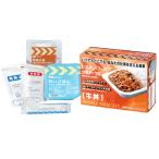 <イザメシDONの特長> 1、水を使わない アルファ化米と出汁スープの袋がセットになっています。 スープをお米に注ぐだけで食べられ、別途お水を用意する必要がありません。 お米のパウチを器にするこができ、スプーンも付属されているので食器が不要です。 2.ボリューム満点 従来のイザメシ、イザメシDeliと比べて、1食あたり1〜1.5人前のボリューム感です。 お子様や女性なら、災害時にシェアしてお召し上がりいただくことも可能です。 玉ねぎと長ねぎ、2種類が入ったボリュームたっぷりの牛丼です。 出汁のしみた牛肉とご飯で、食が進みます。 エネルギー 531kcal たんぱく質 17.4g 脂質 11.1g 炭水化物 88.3g ナトリウム 623mg 食塩相当量 1.6g |