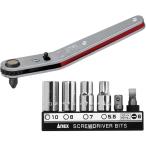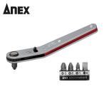 15枚ギアから52枚ギアへ、ANEXが独自のコンパクトビットラチェットを完成させました。 ANEX風の斬新なデザインと指先にフィットする高い操作性をもつハンドル柄が特徴です。 もちろんJAPANと表示されています。 ストレート型(標準型)ハンドル 超コンパクトタイプ(厚み・幅共に20mm未満)スリムな超短ビット(プラスのビット付属)と組み合わせると、極薄ヘッドなため、今までラチェットの使用をあきらめていた狭いスペースにも使用できます。 親指で操作できる正逆切り替えレバー付 超薄ヘッドのため垂直方向への押しつけトルクがアップし、カムアウト防止に有利です。 ラチェットのギア数はギア数は52山で軽く滑らかなフィーリングを実現しています。 複数のギアで噛み合うため、細かいギアでも剛性があり、高トルク(MAX30N.m)に対応できます。 超短プラスビット +2X19mm付属 |