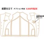 盛夏仕立ては,一般的な背抜きよりも背裏の抜き部分を広く取ることで、通気性の向上と軽い着心地を実現した夏向けの高級仕立てです。 ※ オプション詳細: 本オプション[盛夏仕立て]は、春夏用ジャケットの裏仕様です。 盛夏仕立てをご希望の方は買い物かごに入れてご購入下さい。 ※ 縫製上、チェンジポケットは付けられません。 あらかじめご了承ください。