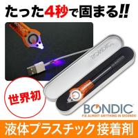 4/19発送になります ※パッケージが画像と異なる場合があります ※メール便発送のため代金引換時間指定使えません セット内容:液体プラスチックカートリッジ(4g)専用UVライト 専用保管ケース 日本語取扱説明書 この驚きの接着剤は100%防水・耐熱のツールです。 溶剤を使用しない液状の接着剤で、付属の専用UV LEDライトで硬化します。 Bondic〓は、乾くと透明で永久的に接着します。 何でも数秒で接着、組み立て、修復、穴埋めができます。 Bondic〓は、プラスチック、木、金属、PVC、スチール、ゴム、配線、セラミック、フィギュア、ビニール、ケブラー、ポリプロピレン、皮革など様々なものに使えます。