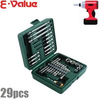 藤原産業 SK11 ソケットビットセット BS-4 29PCS ■特長 ■ ・携帯・保管に便利なプラスチックケース入りです。 ・六角軸鉄工ドリルで、木ネジの下穴あけ、樹脂・薄軟鉄板への穴あけが可能です。 ・ドライバービットで、木ネジ等の締め付けが可能です。 ・ソケットで、ボルト・ナットの締め付けが可能です。 ・付属のイージーチャックを充電ドライバーに装着して使用すれば、ワンタッチでビットの差し替えができます。 ・六角軸鉄工ドリル:2,2.5,3mm ・ドライバービット 両頭ビット:-6×65mm,+1×65mm,+1×110mm,+2×45mm(2本),+2×65mm(3本)・+2×110(2本) 段付ビット:+1×100mm・+2×100mm 1/4インチソケットアダプター 六角ビット50mm長:2,2.5,3,4,5,6mm 1/4インチソケット:6,7,8,10,12,13mm イージーチャック |