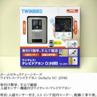 送料無料・保証付・レビューでプレゼント 人感センサー機能付インターフォンです。 動きを感知してカメラ映像を表示します。 動きを感知してカメラLEDを点灯します。 電池駆動の無線接続なので設置工事不要。 カメラは単3電池6本で約1年間動作します。 ■商品名 ツインバード ワイヤレス・テレビドアホン DoNaTa VC-J570S ■玄関カメラ VC-J570-OC型 ・サイズ 約98mm×140mm×45mm ・電源 単3アルカリ乾電池×6本(別売) ・最低被写体照度 1ルックス ・夜間照明方法 白色LED ・電池寿命 約1年 ■屋内モニター VC-J570-IM型 ・サイズ 約85mm×115mm×29mm ・電源 NI-MH 3.6V800mAh 充電電池(付属) ・画面表示 3.5 型 TFTカラー液晶ディスプレー ・使用可能時間 連続通話時間:約2時間、連続待受時:25時間 ・使用距離 約100m(見通し直線距離) ■充電台 VC-J570-CC型 ・サイズ .........__ |