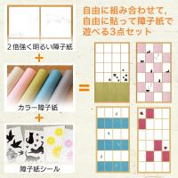 障子紙とシールのセット。 売上人気ナンバー1の障子紙「2倍強く明るい障子紙」とカラーバリエーションが豊富な「インテリア障子紙 カラー和紙」、デコレーションできる「障子紙シール」の3点セットです。 プルダウンメニューがありますので、それぞれの種類・カラーをお選びください。 <2倍強く明るい障子紙>1本で、障子4枚を貼ることができます。 ◎障子紙サイズ:幅94cm×長さ7.2m ◎障子紙1枚入り、「仮止メシール」24枚付き ◎製法:機会漉き ◎材質:パルプ80% 合成繊維20% けい光剤配合 <インテリア障子紙 カラー和紙> ◎和紙サイズ:美濃判サイズの障子戸用(幅28cm×長さ3m巻 1枚入り)または(幅28cm×94cm 2枚入り)カラーにより異なりますので、商品ページをご覧ください。 ◎製法:機械漉き ◎材質はカラーにより異なりますので、商品ページをご覧ください。 <障子紙シール> ◎2シート入り ◎シート.........__ |
