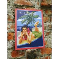 ハワイのヴィンテージアートで目にする絵をそのままブリキ看板にしたのがこちら! レイを身にまとったフラガールをピンナップガール的に描いた作品で、フライトジャケットの背中にデザインされてそうなところが男心に惹かれる部分でもあるね! 横に伸びるこのヤシの木を見て、パッとサンセットビーチだと判断できたアナタはかなりのハワイ通!そんなウンチクも含めて飾るのもおもしろいぞ! ハワイ+ピンナップガール+サンセットビーチ=この最強のコラボレーションをとくとご覧アレ!(≧∀≦)/ サイズ:縦44cm×横31.5cm(約) |