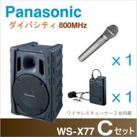WS-X77(Cセット) こちらの商品は ・ワイヤレスパワードスピーカー(WS-X77)(800MHz)、 (ワイヤレス受信機 2台内蔵) ・ワイヤレスマイク(ハンド型) 1本 (WX-4100B x 1) ・ワイヤレスマイク(タイピン型) 1本 (WX-4300B x 1) がセットになった、お買い得セット商品です。 - ※購入後の交換等はできませんのでセット内容・仕様をご確認ください ■800MHz帯PLLワイヤレス受信機を2波内蔵。 ■ワイヤレスマイク2波受信に有線マイク、ライン入力を加えた合計4入力。 (有線マイク2本使用時は、ワイヤレスマイク1波とライン入力1つになります。 ) ■60Wアンプ内蔵。 最大111dB/mの大音量。 ■20cmウーハーとホーンツィーターの2ウェイ。 ■AC電源100V 50/60Hz が必要。 ■スピーカースタンドにも簡単設置可能。 ■内蔵のアンテナ___........ |