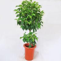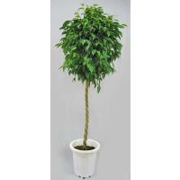 観葉植物 ベンジャミン (スタンダード仕立て) トピアリー 10号A(径30cm)、受皿付。 鉢底から高さ約180cm。 ・クワ科フィッカス属。 ・熱帯、亜熱帯アジア原産。 ・学名:Ficus benjamina。 ・光沢のある小さい葉が美しいベンジャミンです。 ・ゴムの仲間で葉を折ると白い樹液が出ます。 インドなどでは街路樹に使われ、日光を好みます。 ・健康に育てるには三つのポイントがあります。 ・一つ目は、窓際など、できるだけ明るい所に置くことです。 光量が不足すると落葉します。 ・二つ目は、急激な温度変化を与えないことです。 冷房の風を直接当てると落葉する原因になるので、空調の吹き出しから遠いところに置きます。 ・三つ目は、風通しです。 締め切った部屋ではカイガラムシが発生し易く、放置するとベタベタの分泌液を出し、それに黒いカビが生えます。 風通.........__ |