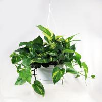 観葉植物、ポトス6号吊鉢(直径18cm)高さ30cm。 葉張り約40cm。 ・サトイモ科エピプレナム属。 ・学名:Epipremnum aureum。 ・和名:オウゴンカズラ(黄金蔓) ・原産地:熱帯アジア、ソロモン諸島 ・つる性植物で鮮緑色卵状の葉に淡黄色の斑が入ります。 新しい葉は非常に艶があり、みずみずしく感じられます。 ポピュラーで姿が美しいだけでなく、あまり明るくないところにも耐え強健で、初心者でも簡単に育てられます。 ・窓際に置いて、強光に当てると葉焼けすることがあるので、レースのカーテン越しの光くらいの所に置きます。 ・サトイモ科の植物は根が太いので、過湿にすると根腐れすることがあります。 土の表面が乾いてから、水をやります。 ・寒さには弱いので、冬は暖房した部屋に置き、水やりの間隔を開け、最低気温8℃以上を保つようにします。 ・暖かい季節は、つるが旺盛に神__........ |