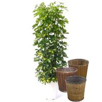 観葉植物、ホンコンカポック(シェフレラ)8号鉢(直径24cm)。 籐かご、受皿付。 高さ約100-120cm。 ・ウコギ科シェフレラ属。 ・原産地:台湾 中国南部 ・学名:Schefflera arboricola。 ・ホンコンカポックの斑入り種で、明るい印象の葉です。 ・置き場:慣らせばかなり耐陰性がありますが、明るい所に置いた方が、丈夫な樹に育ちます。 光量が不足すると、徒長したり、葉が黄色くなったりします。 ・耐寒性:寒さにも強く暖地であれば屋外で冬を越すこともありますが、最初の冬は、部屋の最低温度が3度以上の場所に置き、表土が乾いてから3〜5日待ってから水をやり、乾かし気味の管理をします。 ・水やり:比較的乾燥に強い樹で、夏でも水をやり過ぎると根腐れするので、表土が乾いてから水をやります。 ・葉水:土にやるのとは別に、霧吹きで葉水をあげて、空中湿度を保って下さい。 害虫.........__ |