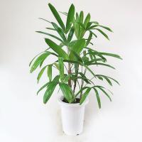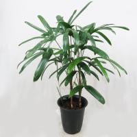 観葉植物、カンノンチク(観音竹)達磨 、だるま、 6号鉢(直径18cm)。 高さ約70〜80cm。 ・ヤシ科ラピス属、中国南部原産。 ・学名:Rhapis excelsa。 ・冬越しの温度:0〜2℃以上 ・観音竹は日本で古くから観葉植物として利用されています。 落ち着いた雰囲気で棕櫚竹より葉が広く、茎がたくさん出るのでボリューム感があります。 和風のイメージが強いのですが、洋風の住宅、オフィスにも合います。 ・達磨は「緑の宝石」などと呼ばれ、流通しています。 成長が比較的緩やかで、室内観葉としては、都合が良いです。 ・寒さに強く木造住宅でも十分冬越しできますが、厳冬の年は油断しないでください。 ・弱光にも耐え、病害虫もあまり発生しないので非常に育て易い観葉植物です。 夏は半日陰に置きますが、日照不足では弱ります。 ・水切れに注意し、土が乾いたらしっかりとやります。<.........__ |