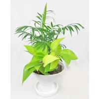 観葉植物、テーブルヤシ陶器鉢(皿)サイズ(w0410);直径170mm(底67mm)×高さ120mm。 全高約40cm。 ≪テーブルヤシ(チャメドレア)≫ヤシ科。 学名:Chamaedorea elegans。 世界の熱帯・亜熱帯に分布。 越冬温度5〜7℃以上。 日光を好みますが、耐陰性もあり室内でも元気にしています。 緑がとても豊かですが、全体的に小ぶりのなため観葉植物として最適です。 出来れば窓際など明るいところに置いてください。 寒さにも比較的強いので管理しやすい植物です。 <br />≪ライムポトス≫別名;黄金カズラ。 サトイモ科、エピプレナム属。 つる性植物。 南太平洋ソロモン諸島原産。 ポトスは室内のグリーンインテリアとして最もポピュラーで丈夫で美しい観葉植物。 葉の色が他の植物にあまりない明るいライム色をしているので、お部屋が明るく、やさしい感じになり.........__ |