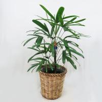 観葉植物、カンノンチク(観音竹)達磨 、だるま、 6号鉢(直径18cm)。 藤かごk皿付。 高さ約70〜80cm。 ・ヤシ科ラピス属、中国南部原産。 ・学名:Rhapis excelsa。 ・冬越しの温度:0〜2℃以上 ・観音竹は日本で古くから観葉植物として利用されています。 落ち着いた雰囲気で棕櫚竹より葉が広く、茎がたくさん出るのでボリューム感があります。 和風のイメージが強いのですが、洋風の住宅、オフィスにも合います。 ・達磨は「緑の宝石」などと呼ばれ、流通しています。 成長が比較的緩やかで、室内観葉としては、都合が良いです。 ・寒さに強く木造住宅でも十分冬越しできますが、厳冬の年は油断しないでください。 ・弱光にも耐え、病害虫もあまり発生しないので非常に育て易い観葉植物です。 夏は半日陰に置きますが、日照不足では弱ります。 ・水切れに注意し、土が乾いたらし.........__ |