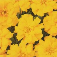 純黄色。 【ボナンザ系】 フレンチ系は草姿がやや矮性で横に広がり、比較的小さめの花がたくさん長期間咲くのが特徴。 夏の強い日差しのなかでも花つきがよく、早咲きタイプの大輪で草丈約20cm。 花径5〜6cm。 「聖母マリアの黄金の花」の意味を持ち、その黄金を連想させる花色が特徴で人気がある。 フレンチ系(孔雀草)とアフリカン系(万寿菊)の大きく2つに分けられるが、両方の種間雑種も増え、様々な品種が出てきている。 キク科 |