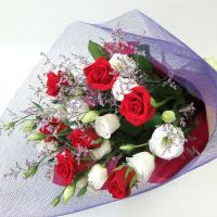 ご用途:誕生日・記念日・お祝い・歓送迎・結婚祝い・結婚記念日 形態:花束・送料無料 花材:赤バラ・トルコキキョウ・ブルー系の小花 サイズ: 長さ:約50cm×幅:約28cm ※品種はその日に入荷したおすすめのものになります。 写真とは若干色合いや形が異なる場合がございますが、ご了承下さい。