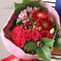 おまかせブーケ(レッド系) レッドカラーの花束です。 高さ約32×幅約32×奥行約32cm ※サイズは、ご相談ください。