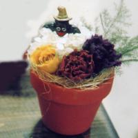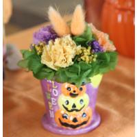 かわいいハロウィン絵柄の陶器のポットに、ポットに合わせたパープルとイエローのカーネーションとアジサイなどの小花をアレンジしました。 こんなキュートでポップなハロウィンもかわいいでしょ。 ちょっと飾っておくのにかわいいサイズ。 直径約9cm、高さ約13cm。 スプレーカーネーション3輪使っています。