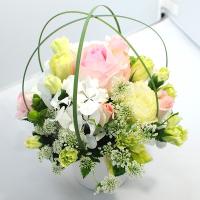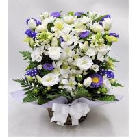 送料無料 淡く可愛い色のお供えアレンジメントです。 高さ約35cm×幅約30cm×奥行約28cm ※サイズは、ご相談ください。