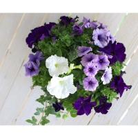−−−−−−−−−−−−− ■ブルー系のペチュニアを8株植え込んだ作品です。 (配色は若干変更する場合があります。 ) ■開花期:3月〜11月(咲き続けます!) ■注意:日当たりが必要です。 ■初心者の方やギフトにも最適です。 商品・寄せ植え済みハンギングバスケット+S字フック1つ容器サイズ:縦23cm×横25cm×奥行き17cm(伊藤商事SLT25)総重量:約3kg |