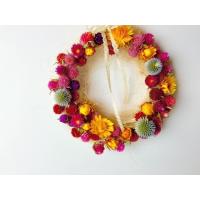 小さくて丸い形の千日紅をメインにしてちょっぴりかわいいリースができました。 ちょっとした場所に飾れるプチサイズ。 贈り物にもどうぞ! ザ・ローズショップオリジナルのフラワーリースです。 さわやかな信州で育った草花たちは自然乾燥されて 優しい色合いをお楽しみいただけます。 子供部屋や小さなコーナーにもどうぞ! こちらは飾ったイメージです。 撮影小物等は含まれません。 窓辺に下げてもいい感じ〜。 お祝いや記念日などこのまま贈りものにもどうぞ。 専用の箱にお入れしてお届けします。 資材 リース台 千日紅、ルリ玉あざみ、帝王貝細工 レースのリボン など 大きさ リース台 直径20センチくらい (手作りのため多少の大きさは変わります。)
