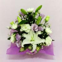 白いユリ(オリエンタルリリー)と菊、トルコキキョウを基調に、紫のトルコキキョウをコーディネイトしてお作りした、お供えのアレンジメントです。 ご用途:お供え・命日・お悔やみ・法事・お盆・お彼岸 |