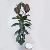 観葉植物、フィカス・バーガンディ クロゴム 黒ゴム 8号鉢(直径24cm)、 受け皿付、高さ約110cm。 ・クワ科フィカス属。 ・学名:Ficus elastica burgundy。 ・インド原産。 ・フィカス・バーガンディーは、園芸品種のデコラゴムノキの実生による変種で、デコラゴムノキに比べ葉が丸く大きく厚いです。 「ブラック・フィカス」とも呼ばれ、黒くて光沢のある葉が特徴で、赤い新芽も美しいです。 ・耐陰性もありますが原産地では明るい戸外に生えている木なので、窓の近くや、照明の下など明るい場所に置いた方が元気です。 光量不足になると、元気がなくなります。 ・冬は乾燥気味にすれば5℃以上で冬越しできます。 ・成長が早いので、大きくなりすぎたら、部屋の広さに合わせて切り詰めます。 ・水やり:鉢土の表面が乾いたら、しっかりやります。 水やりとは別に、霧吹きで株全体に葉水を___........ |