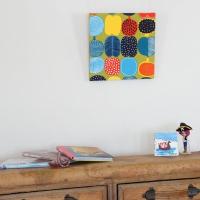 ■marimekko Rasymatto ■designer:Maija Louekari ■SIZE :450×450×25mm ■付属品 :取り付け、釘、説明書 まだらな丸模様がーで描かれた、な です。 1枚が大きく1枚でも十分に可愛い空間になります。 ※写真は枚数を並べたーです。 ※40×40cmの1枚からの販売です。