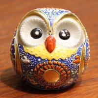 九谷焼金(素地:石川県産、加飾:九谷焼産地) 素材:磁器 :幅7cm×奥行7cm×高さ7cm 箱:紙箱 一点一点手描きの、九谷焼のふくろうです。 手のひらにのる小ささながら、存在感もあるなので、玄関や、飾り棚に置いておくと、可愛らしく、映えそうです。 ふくろうは「不苦労(苦労知らず)」「福来朗(福が来る)」に通じ、縁起の良い鳥とされています。 また、知恵・長寿の神ともいわれ、首が回ることから商売繁盛(先見力)の味方にも。 風水では、緑色は健康運と効果をもたらす色といわれています。