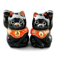 九谷焼金(素地:石川県産、加飾:九谷焼産地) 素材:磁器 :幅4.5cm×奥行4.5cm X 高さ7cm 一点一点手描きで、表情豊かな九谷焼の招き猫。 ちょこんと手のひらに乗るで、机や本棚に置くと、目が合うたびになんとも微笑ましい気持ちになります。 右手をあげているのはお金、左手をあげているのは人や縁を招いてくれます。 黒い招き猫には、厄除けの意味があるといわれています。