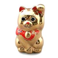 九谷焼金(素地:石川県産、加飾:九谷焼産地) 素材:磁器 :幅4.5cm×奥行4.5cm X 高さ7cm 一点一点手描きで、表情豊かな九谷焼の招き猫。 ちょこんと手のひらに乗るで、机や本棚に置くと、目が合うたびになんとも微笑ましい気持ちになります。 右手をあげているのはお金、左手をあげているのは人や縁を招いてくれます。 金色の招き猫は、金運をさせてくれるといわれています。