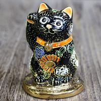 九谷焼金(素地:石川県産、加飾:九谷焼産地) 素材:磁器 :幅2.5cm X奥行2.5cm×高さ3cm 一点一点手描きで、表情豊かな九谷焼の招き猫。 高さ3cmのなのでどこにでも置くことができ、いつもそばで見守っていてくれます。 左手をあげているので、人や縁を招いてくれます。 黒い招き猫には、厄除けの意味があるといわれています。